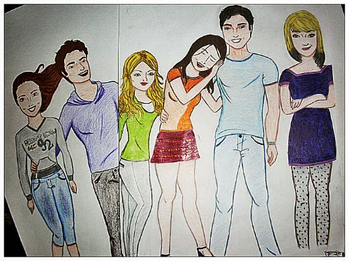 Eu estava lendo o volume 2 e o 3 pela segunda vez, e senti uma vontade imensa de colocar no papel tudo que vinha á minha cabeça quando eu pensava na Fani, no Leo, na Gabi e na Nat. Então desenhei como eu acho que são as personagens da série, com base no que eu lia e na personalidade de cada um.